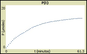 En este tipo de sistemas, para una dada concentración de sustrato, la velocidad, expresada como formación de producto en función del tiempo, se mantiene constante durante un cierto período y se la denomina velocidad inicial (V). Se calcula como la pendiente de P vs t en ese tiempo. Luego, puede disminuir por diferentes motivos (consumo de sustrato, inhibición por producto, degradación de la enzima, etc.), como se ve en el siguiente gráfico: