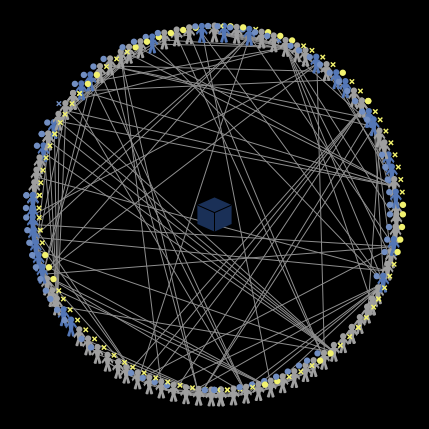 In this model, people are linked together in a social network. The network is designed to mimic the organization of a workplace. It is created in three steps: first, each person is assigned to be a member of 1-3 different work teams, each of which have between 2-5 members. Second, 10% of people create random additional links to others in the network. Third, any disconnected components are connected to the larger network. The result is intended to roughly represent the aggregation of formal and informal relationships in a moderate-to-large organization, such as the one Leonardi studied. Because people are primarily connected to a relatively small number of others nearby to them but also have some cross-network ties, the network has small world properties.