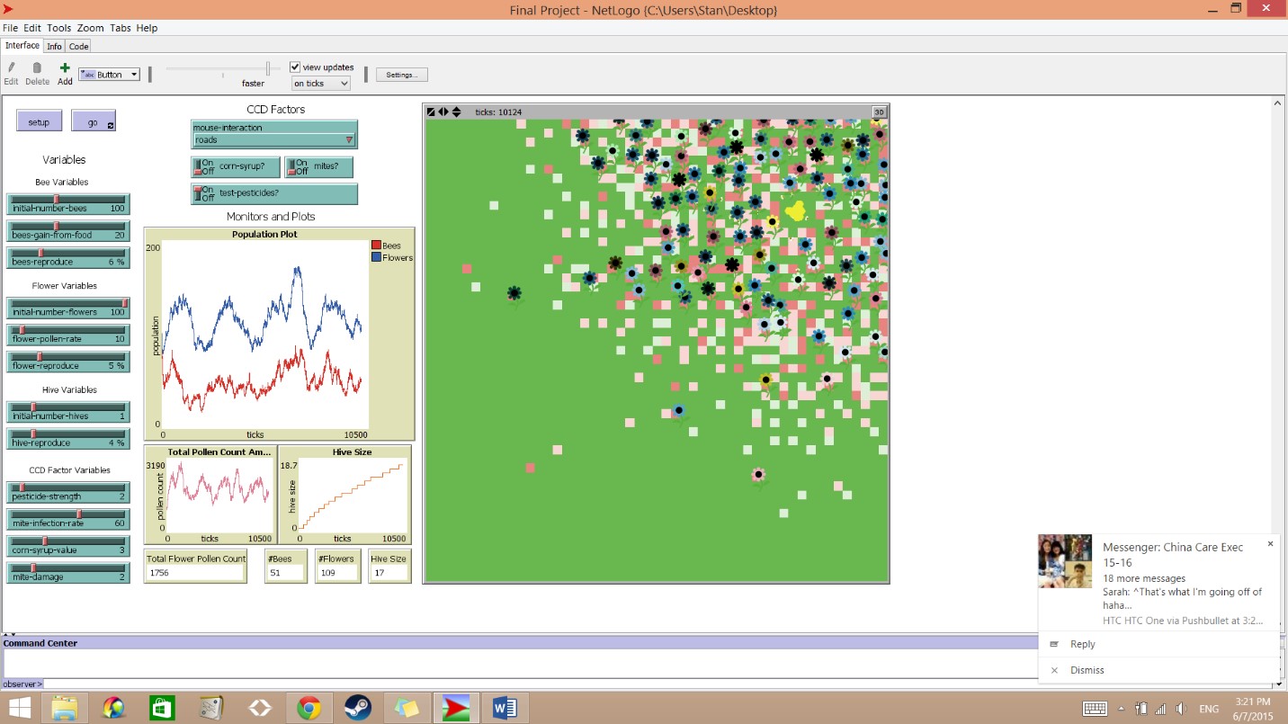 The model maps out a population of honey bees, wild flowers, and hives, that are affected by different settings as indicated by the user.
