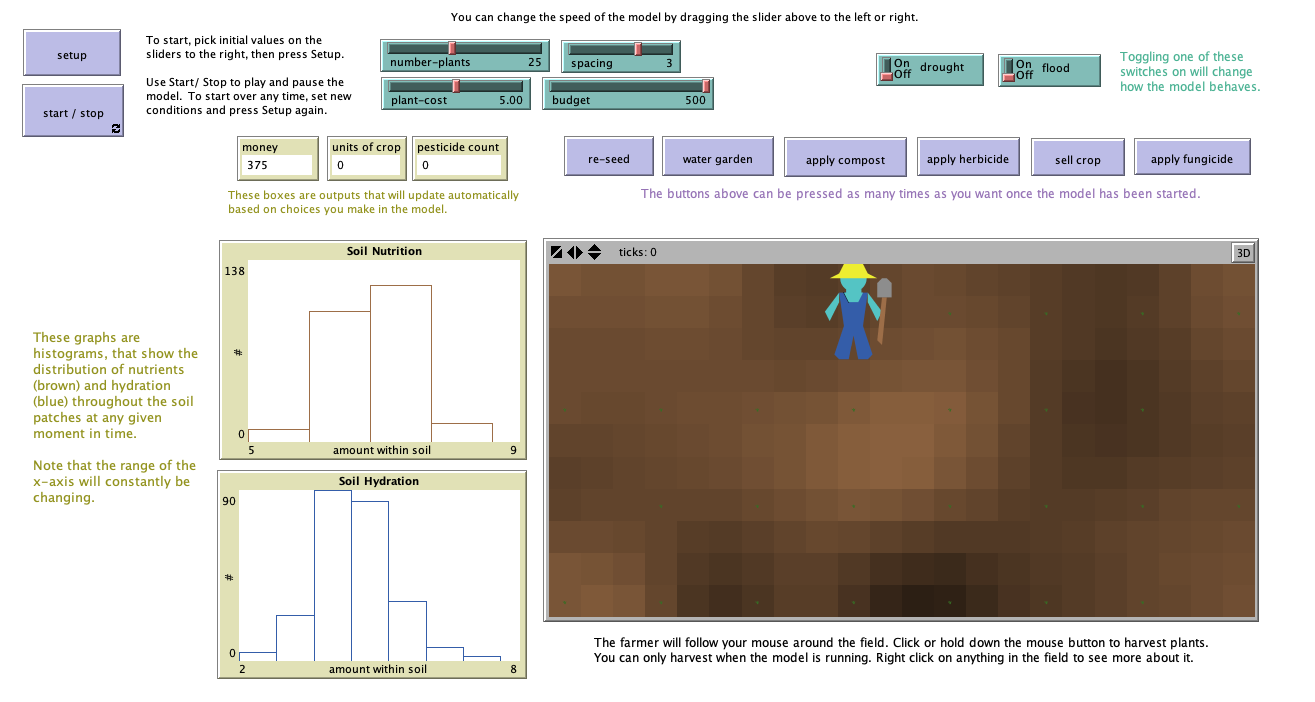 Set the slider buttons on the top of the screen to the value that you'd like, then press 'Setup'. When you're ready to start, press 'Start/Stop', and then the farmer will follow your mouse. Hold down the mouse button to harvest a plant. You can click the interface buttons (light purple) at any time while the model is running, or press 'Start/Stop' again to pause it.