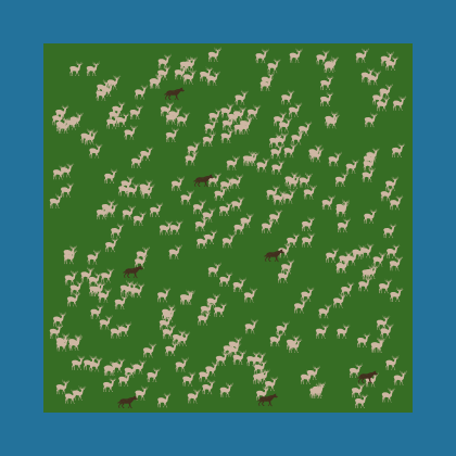 Other herbivores: Many other species also consume grass. What will happen if you introduce rabbits, another grass-eater, here? To simplify the simulation, the introduced rabbits do not reproduce. You may use the corresponding slider to adjust the number of rabbits. In this simplified world, wolves do not prey on rabbits.