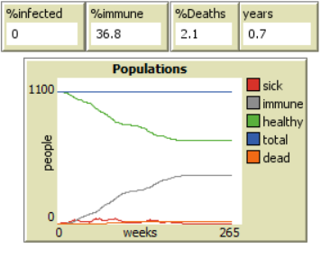 Think about how different slider values might approximate the dynamics of real-life viruses. The famous Ebola virus in central Africa has a very short duration, a very high infectiousness value, and an extremely low recovery rate. For all the fear this virus has raised, how successful is it? Set the sliders appropriately and watch what happens.
