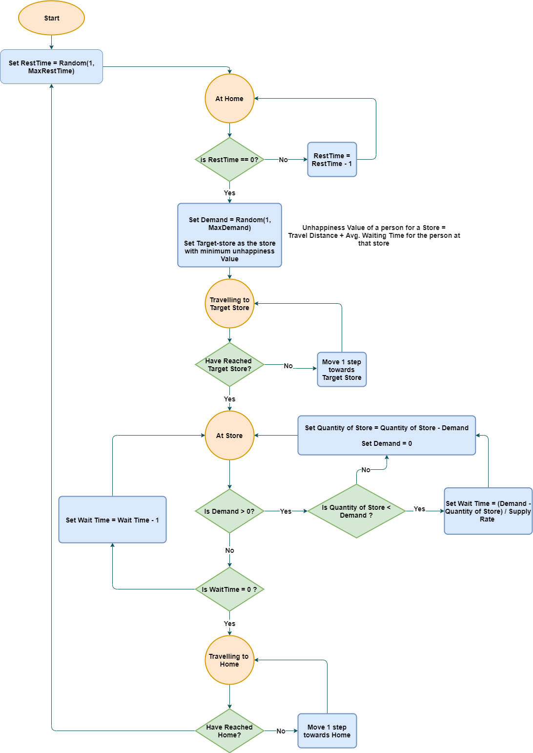 - When the rest time becomes zero, the customer makes a decision to which store to visit based on the store with least unhappiness value. (Unhappiness of a customer with respect to a store = Travelling distance from store + Average waiting time at the store)