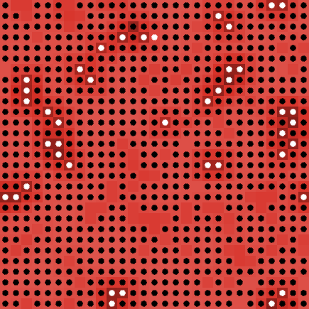 Each time step, every patch will calculate the temperature at that spot based on (1) the energy absorbed by the daisy at that patch and (2) the diffusion of 50% of the temperature value at that patch between its neighbors. Open ground patches that are adjacent to a daisy have a probability of sprouting a daisy that is the same color as the neighboring daisy, based on a parabolic probability function that depends on the local temperature (where an optimum temperature of 22.5 yields a maximum probability of 100% of sprouting a new daisy). Daisies age each step of the simulation until they reach a maximum age, at which point they die and the patch they were in becomes open.