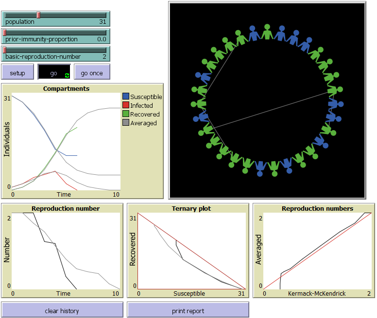extensions [array] globals [reproduction-number old-infected new-infected time iteration iteration-s iteration-i iteration-r iteration-r0x sum-s sum-i sum-r average-s average-i average-r average-r0x kmck ] breed [individuals individual] individuals-own [ state ;; my current state: "INFECTED", "RECOVERED", or "SUSCEPTIBLE" marked? ;; whether I'm currently marked ] to clear-history [clear-all?] if clear-all? [ ;; clear the ensemble set sum-s [] set sum-i [] set sum-r [] set average-s [] set average-i [] set average-r [] set average-r0x [] set kmck [] set iteration 0 ] ;; clear the iteration set iteration-s [] set iteration-i [] set iteration-r [] set iteration-r0x [] set time 0 set iteration (iteration + 1) end to-report count-state [compartment] report (count individuals with [state = compartment]) end to-report last-or-zero [last-index lsum] ifelse last-index = -1 [ report 0 ] [ report item last-index lsum ] end to extend-sums let last-index ((length sum-s) - 1) while [ length sum-s < length iteration-s] [ set sum-s lput (last-or-zero last-index sum-s) sum-s set sum-i lput 0 sum-i set sum-r lput (last-or-zero last-index sum-r) sum-r set average-s lput 0 average-s set average-i lput 0 average-i set average-r lput 0 average-r set average-r0x lput 0 average-r0x ] end to-report add-sum [t1 t2 lsum liter] report replace-item t1 lsum ((item t1 lsum) + (item t2 liter)) end to-report get-average [t lsum lav] report replace-item t lav ((item t lsum) / iteration) end to-report compute-reproduction-number [t lav] ifelse t = 0 [ report basic-reproduction-number ] [ report (item t lav) / (item (t - 1) lav) ] end to add-sums let t 0 while [ t < length iteration-s] [ set sum-s (add-sum t t sum-s iteration-s) set sum-i (add-sum t t sum-i iteration-i) set sum-r (add-sum t t sum-r iteration-r) set average-s (get-average t sum-s average-s) set average-i (get-average t sum-i average-i) set average-r (get-average t sum-r average-r) set average-r0x (replace-item t average-r0x (compute-reproduction-number t average-i)) set t (t + 1) ] let last-index ((length iteration-s) - 1) while [ t < length sum-s] [ set sum-s (add-sum t last-index sum-s iteration-s) set sum-i (add-sum t last-index sum-i iteration-i) set sum-r (add-sum t last-index sum-r iteration-r) set average-s (get-average t sum-s average-s) set average-i (get-average t sum-i average-i) set average-r (get-average t sum-r average-r) set average-r0x (replace-item t average-r0x (compute-reproduction-number t average-i)) set t (t + 1) ] end to calc-kmck set kmck [] set kmck lput basic-reproduction-number kmck let t 1 while [ t < length average-s] [ let val (item (t - 1) average-s) set val (val + (item t average-s)) set val 0.5 * basic-reproduction-number * val set val (val / population) set kmck lput val kmck set t (t + 1) ] end to extend-history if time >= (length iteration-s) [ set iteration-s lput (count-state "SUSCEPTIBLE") iteration-s set iteration-i lput (count-state "INFECTED") iteration-i set iteration-r lput (count-state "RECOVERED") iteration-r set iteration-r0x lput (compute-reproduction-number time iteration-i) iteration-r0x ] set time (time + 1) end to plot-array [y] let t 0 while [ t < length y] [ if t = 0 [ plot-pen-up ] plotxy t (item t y) plot-pen-down set t (t + 1) ] end to plot-arrays [x y] let t 0 while [ t < length x] [ plotxy (item t x) (item t y) set t (t + 1) ] end to print-table [s i r r0x] print "Time, S, I, R, Reproduction number" let t 0 while [ t < length s] [ type t type ", " type (item t s) type ", " type (item t i) type ", " type (item t r) type ", " print (item t r0x) set t (t + 1) ] end to print-report type "Population " print population type "Proportion of population with prior immunity " print prior-immunity-proportion type "Basic reproduction number " print basic-reproduction-number type "Iterations " print iteration print "" print "Current" print-table iteration-s iteration-i iteration-r iteration-r0x print "" print "Ensemble average" print-table average-s average-i average-r average-r0x print "" end to dont-clear-all ;;clear-globals clear-ticks clear-turtles clear-patches clear-drawing clear-all-plots clear-output end to setup dont-clear-all clear-history (sum-s = 0) ;; set up the model make-turtles set reproduction-number basic-reproduction-number set new-infected 1 extend-history recolor reset-ticks end ;; create all the turtles, place them, and associate forks with individuals to make-turtles set-default-shape individuals "person torso" ;; create-ordered-equally spaces the headings of the turtles, ;; in who number order create-ordered-individuals population [ set size 0.1 jump 0.35 set state "SUSCEPTIBLE" set marked? false ] ask individual 0 [set state "INFECTED"] if prior-immunity-proportion > 0 [ let index 1 repeat prior-immunity-proportion * population [ ask individual index [set state "RECOVERED"] set index (index + 1) if index >= population [ stop ] ] ] end to go if new-infected > 0 [ a-go ] end to a-go set old-infected new-infected clear-links ask individuals [ infect ] set new-infected 0 ask individuals [ update ] ifelse old-infected = 0 [ set reproduction-number 0 ] [ set reproduction-number (new-infected / old-infected) ] recolor extend-history if new-infected = 0 [ extend-sums add-sums calc-kmck ] tick end ;; everybody gets a new color. to recolor ask individuals [ ;; look up the color in the colors list indexed by our current state ifelse state = "SUSCEPTIBLE" [ set color blue ] [ ifelse state = "INFECTED" [ set color red ] [ set color green ] ] ] end ;; to infect ;; individual procedure if state = "INFECTED" [ ;; create an array of random numbers let values array:from-list shuffle range (population - 1) let index 0 repeat basic-reproduction-number [ let i2 array:item values index let i3 ((i2 + 1 + who) mod population) ask individual i3 [set marked? true] create-link-with individual i3 set index (index + 1) ] ] end ;; to update ;; individual procedure if state = "INFECTED" [ set state "RECOVERED" ] if mar